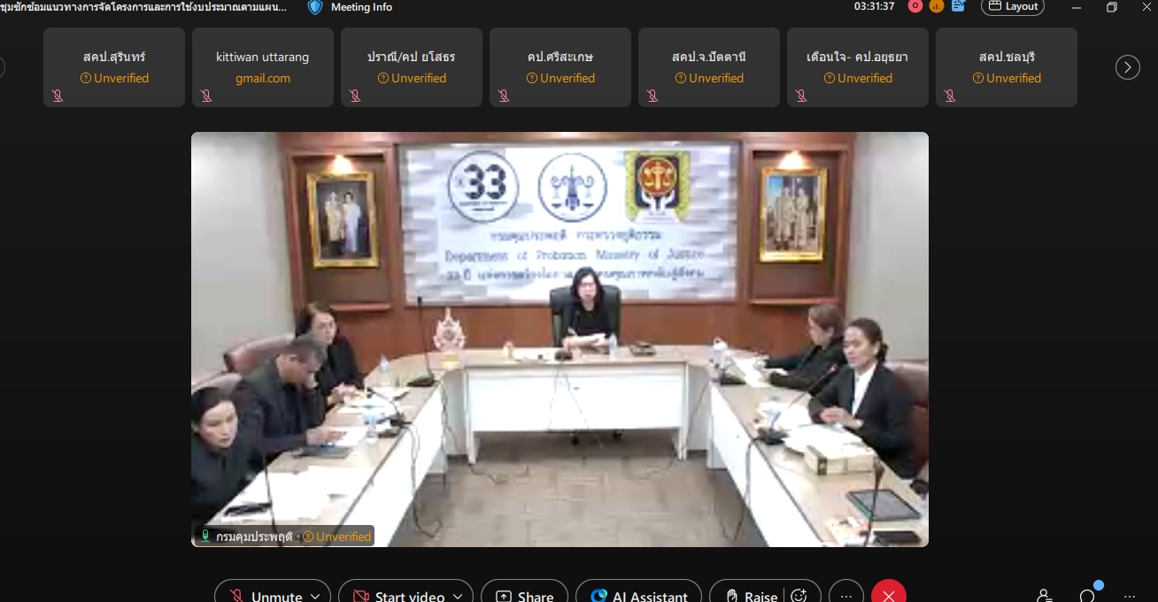 วันที่ 4 พฤศจิกายน 2568 ว่าที่ร้อยโท สิทธิ์ธนัตถ์ สิทธิบัวศรี ผู้อำนวยการสำนักงานคุมประพฤติจังหวัดสุรินทร์ พร้อมด้วย นางสาวอัจฉราพรรณ ลวดลาย พนักงานคุมประพฤติชำนาญการพิเศษ หัวหน้ากลุ่มยุทธศาสตร์การคุมประพฤติ หัวหน้ากลุ่มคุมประพฤติพื้นที่ 1,2 หัวหน้าฝ่ายบริหารงานทั่วไป และเจ้าหน้าที่ที่เกี่ยวข้อง เข้าร่วมประชุมการซักซ้อมแนวทางในการใช้จ่าย งบประมาณรายจ่าย ประจำปี พ.ศ.2569 ในรูปแบบประชุมทางไกล (Online conference) ด้วยระบบ Webex Metting โดยมี นางยศวันต์ บริบูรณ์ธนา รองอธิบดีกรมคุมประพฤติ เป็นประธานในการประชุม ณ ห้องประชุม ชั้น 2 สำนักงานคุมประพฤติจังหวัดสุรินทร์ ตำบลนอกเมือง อำเภอเมืองสุรินทร์ จังหวัดสุรินทร์